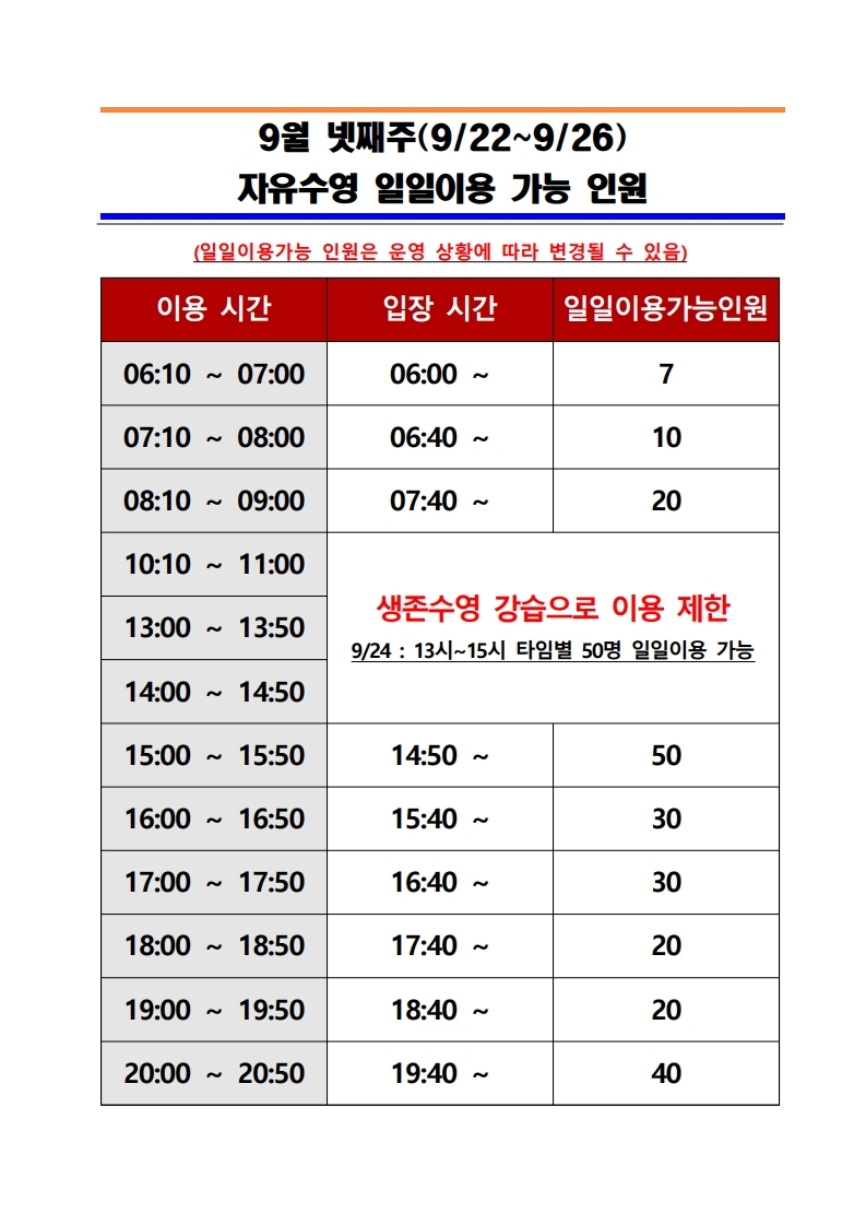 9월 넷째주(9/22~9/26) 평일 자유수영 일일이용 가능 인원2025-09-19 | |||