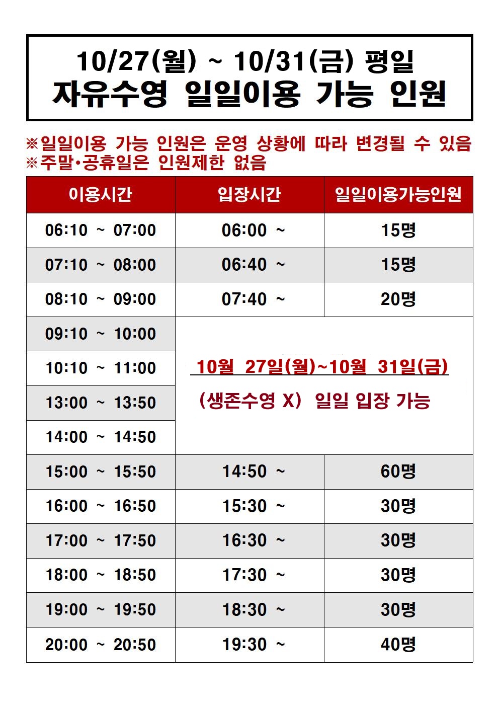 | 평일 자유수영 일일이용 가능 인원(10/27~10/31)2025-10-25 | |||