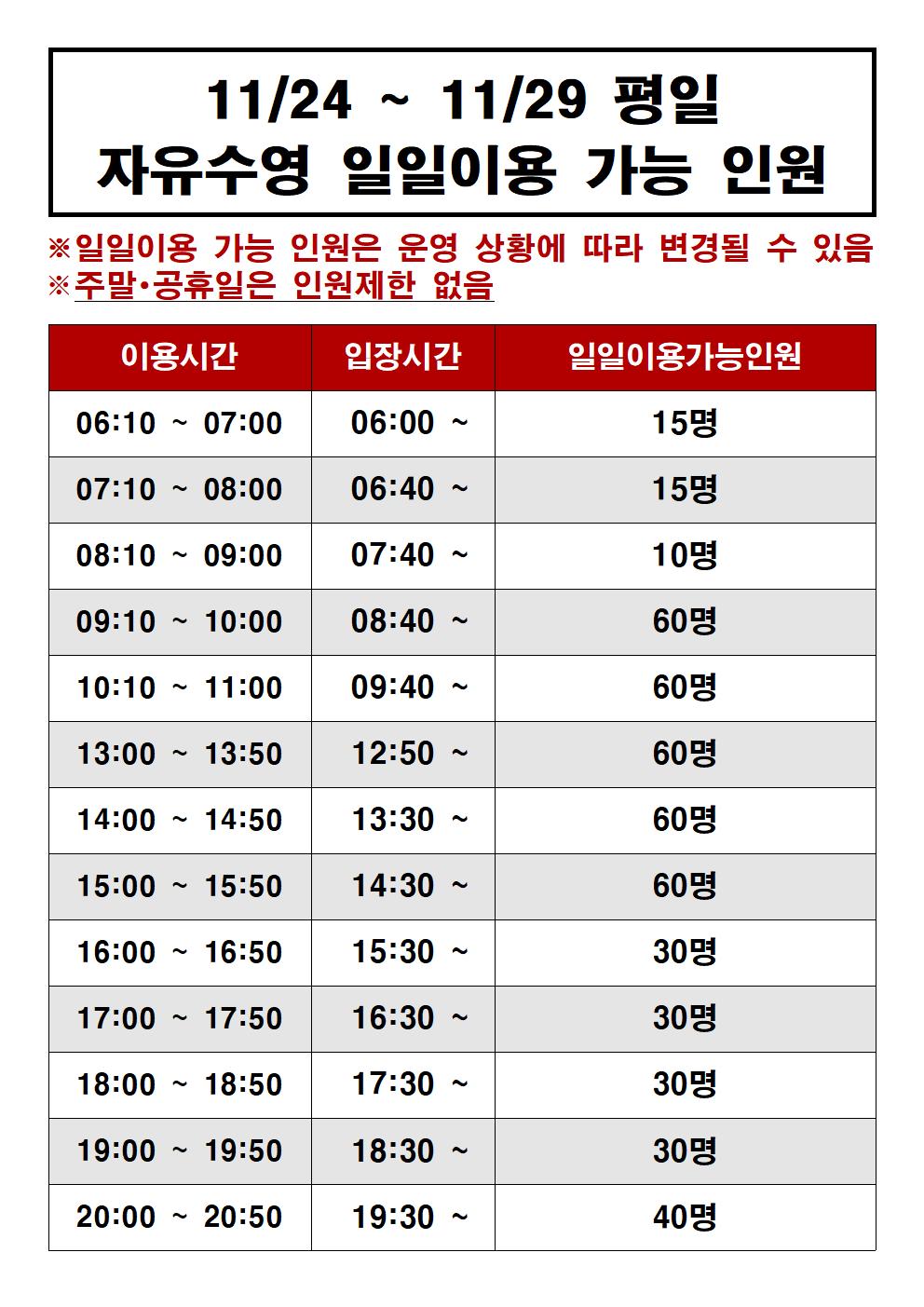 | 평일 자유수영 일일이용 가능 인원(11/24~11/29)2025-11-21 | |||