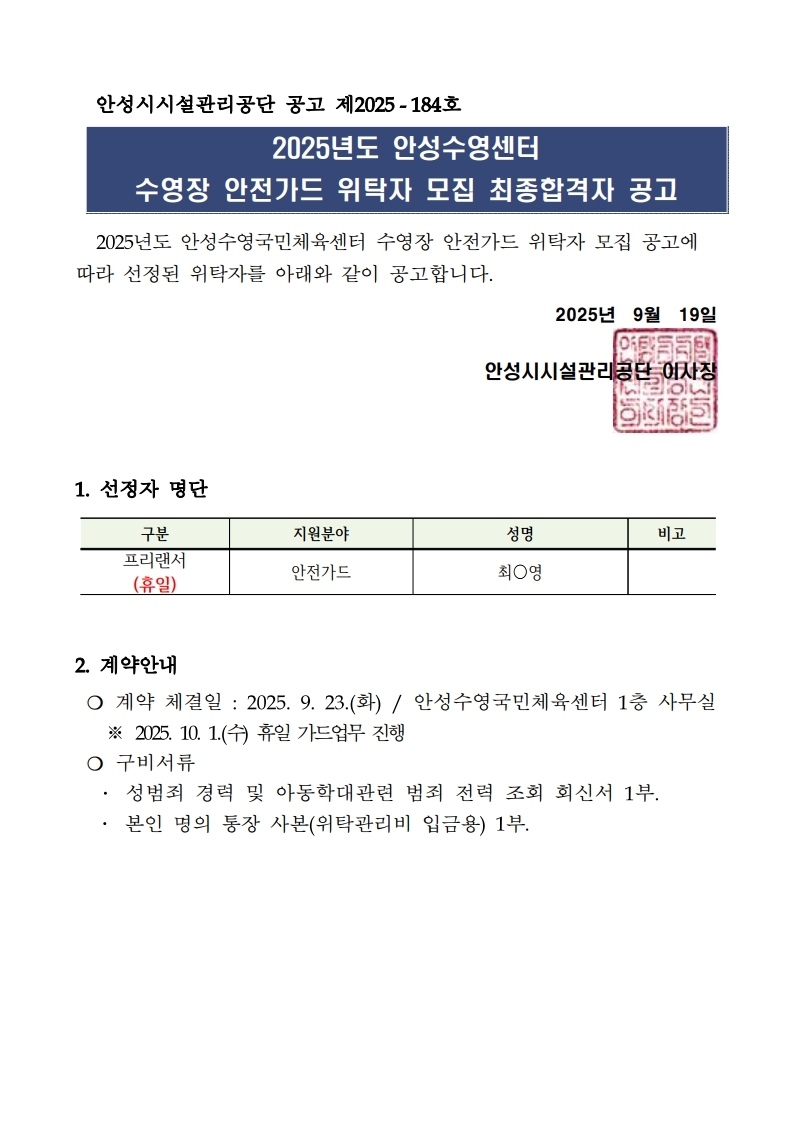 2025년 안성수영센터 수영장 안전가드 위탁자 최종합격자 발표 2025-09-19 | |||