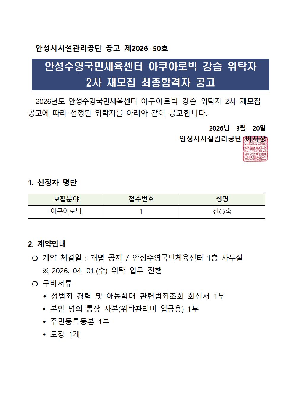 | 안성수영국민체육센터 아쿠아로빅 강습 위탁자 2차 재모집 최종합격자 공고2026-03-20 | |||